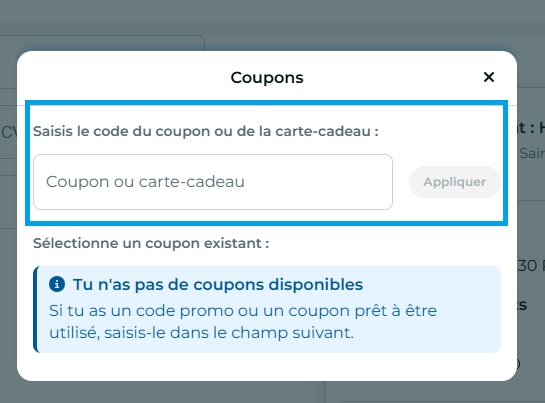 - Entrez votre bon de réduction dans cette case, puis validez pour appliquer l’avantage.