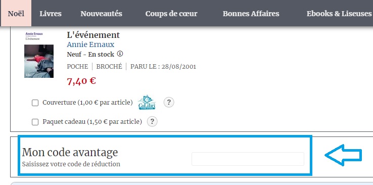 - Vous y trouverez un champ nommé : “Mon code avantage-Saisissez votre code de réduction”. C'est dans cette case que vous devez insérer votre code promotionnel Furet du nord.