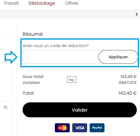 - Dans le champ réservé au code promo, saisissez votre code de réduction Regatta, puis validez en cliquant sur “Appliquer”. Le montant de la remise s’affiche immédiatement sur le total de votre commande.