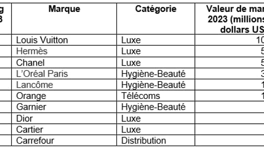 Dans le top 10, deux marques échappent à l'hégémonie du secteur luxe et hygiène-beauté. Orange s'affiche à la sixième position, seul représentant des télécoms et Carrefour se classe dixième.