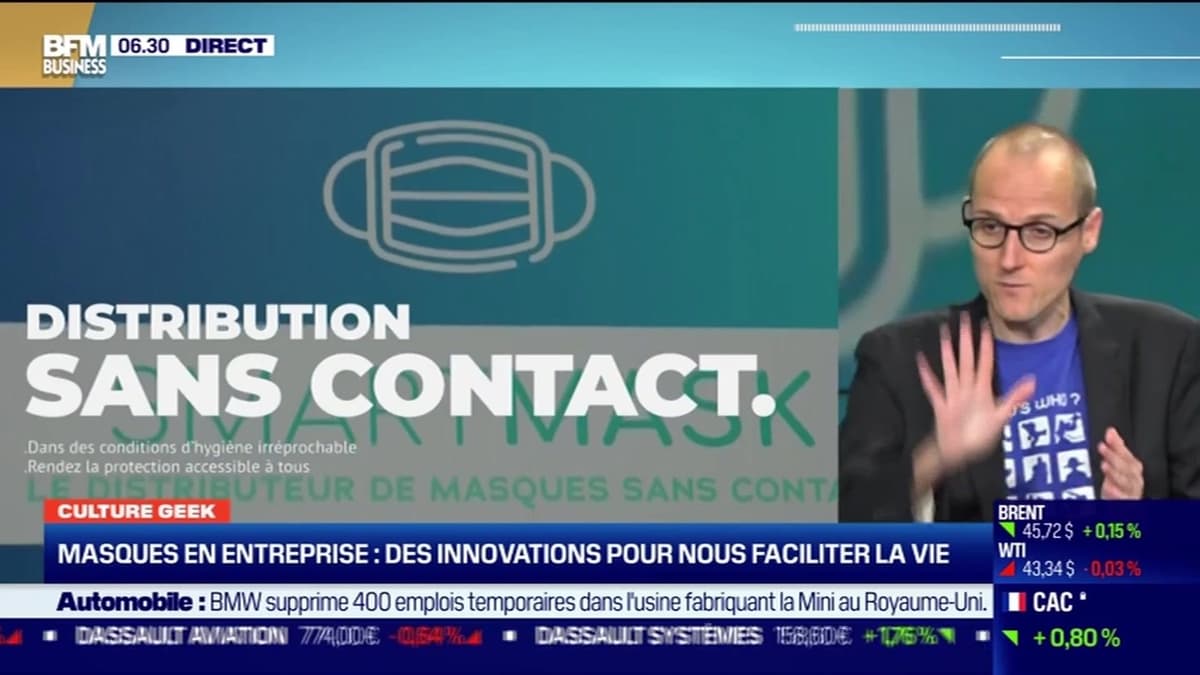 Ce jeudi 27 août, dans Culture Geek, Anthony Morel nous présente des moyens de rendre moins contraignant le port du masque obligatoire en entreprise, en vigueur d'ici quelques jours. Cette chronique est à voir ou écouter du lundi au vendredi dans Good morning business présentée par Sandra Gandoin et Christophe Jakubyszyn sur BFM Business.