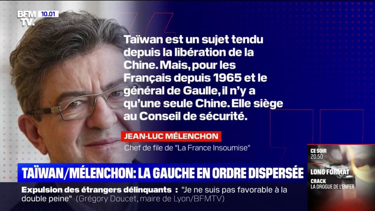 BFMTVPolitiqueLa France InsoumiseLa Nupes divisée après les propos de Jean-Luc Mélenchon sur TaïwanIl a suffi d’une phrase écrite par Jean-Luc Mélenchon sur le statut de Taïwan, pour réveiller les divisions au sein de la Nupes.Le 06/08/2022 à 10h47 | Durée : 1:17PartagerX