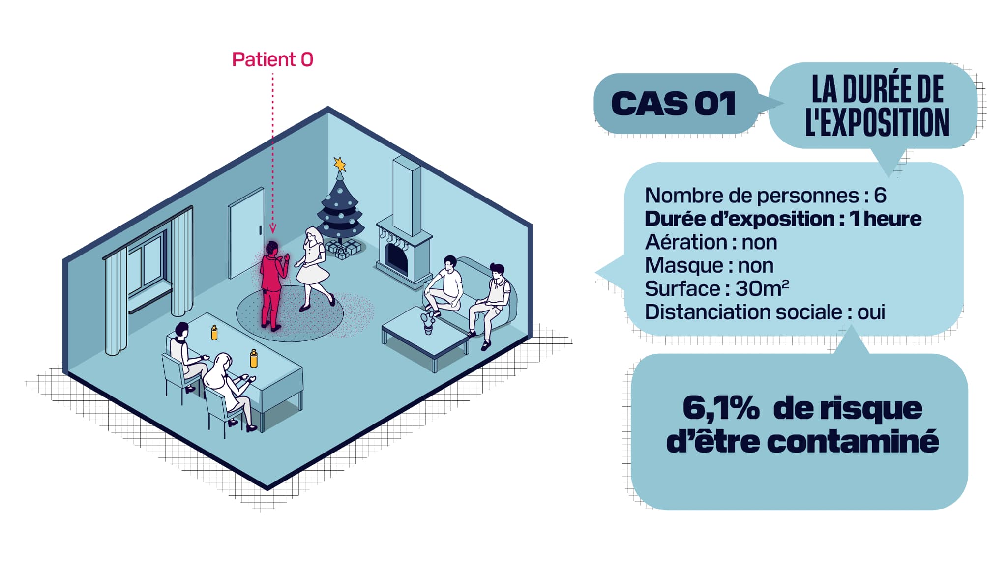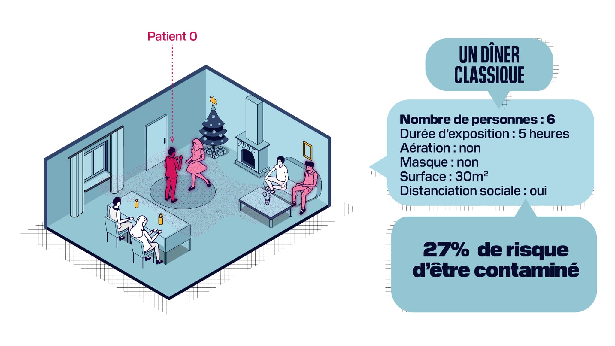 BFMTV.com a ainsi créé sa propre simulation: un repas de Noël réunissant six convives - comme le recommande le gouvernement - pendant cinq heures dans une pièce standard de 30m2 avec 2,4m de hauteur sous plafond. Autre élément pris en compte: les convives respectent la distanciation sociale et les règles d'hygiène comme le lavage des mains pour éviter la contamination par postillons, qu'elle soit directe ou par contact avec des surfaces contaminées.