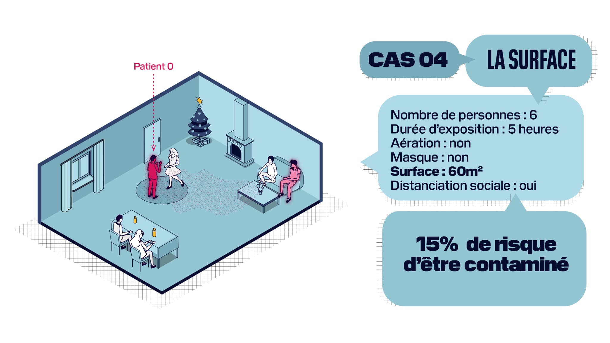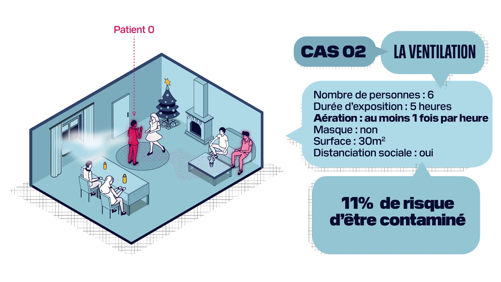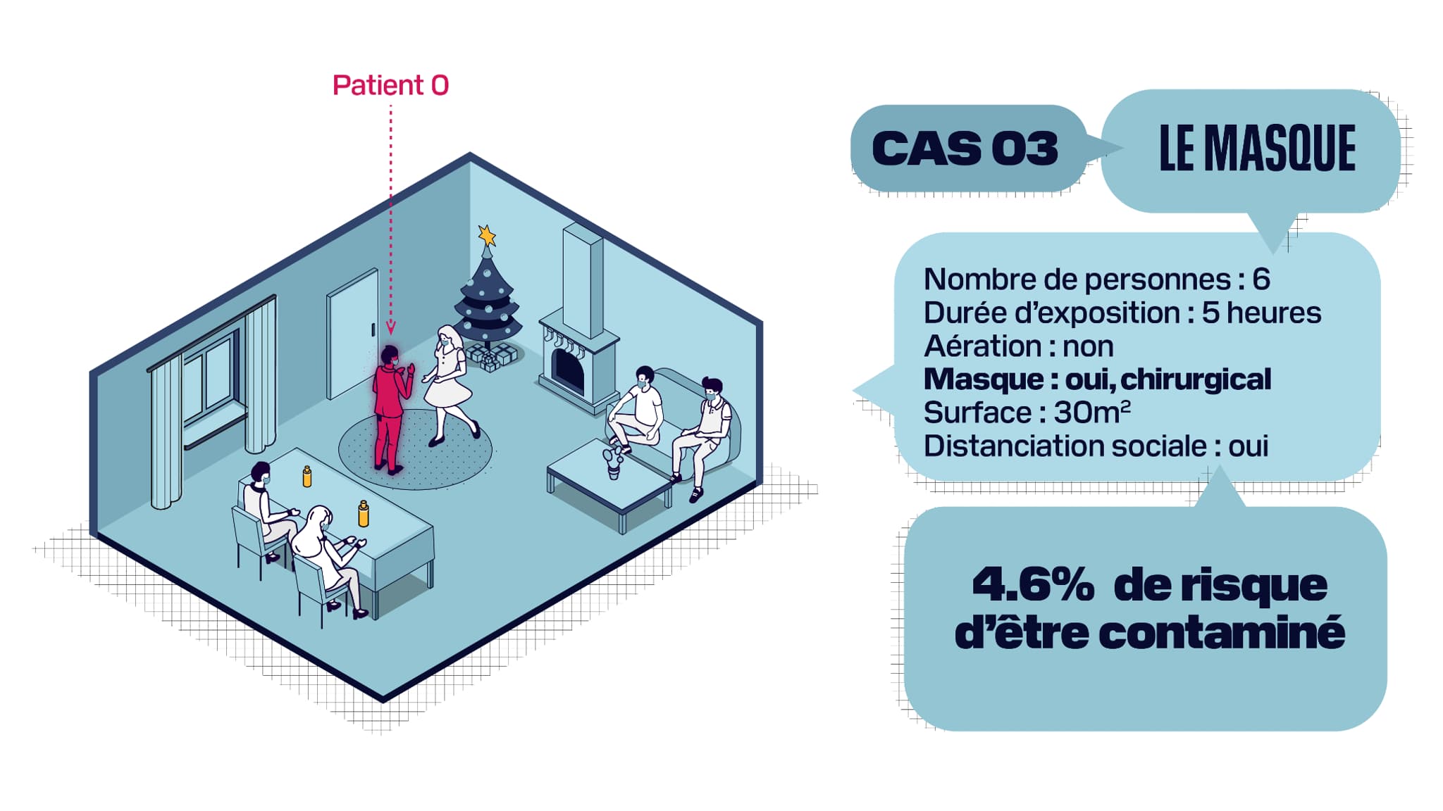 Enfin dernier élément pris en compte dans notre scénario: la surface de la pièce. Si cette dernière est deux fois plus grande, pour un total de 60m2, alors même sans être aérée, même si les convives ne portent pas de masque et même s'ils y séjournent cinq heures, il y a quasiment deux fois moins de risques d'être contaminé que dans une pièce de 30m2.