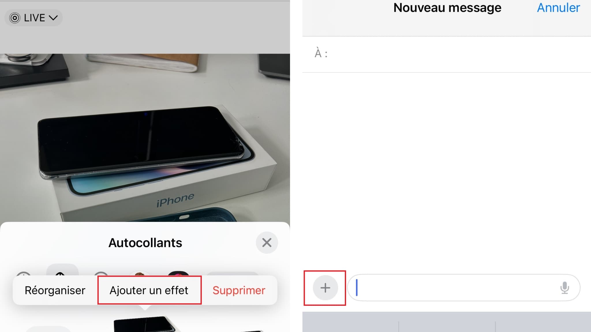 - Cliquez sur "Ajouter un effet" si vous souhaitez modifier le détourage. Ensuite, rendez-vous dans l'application Messages et cliquez sur le bouton "Plus"