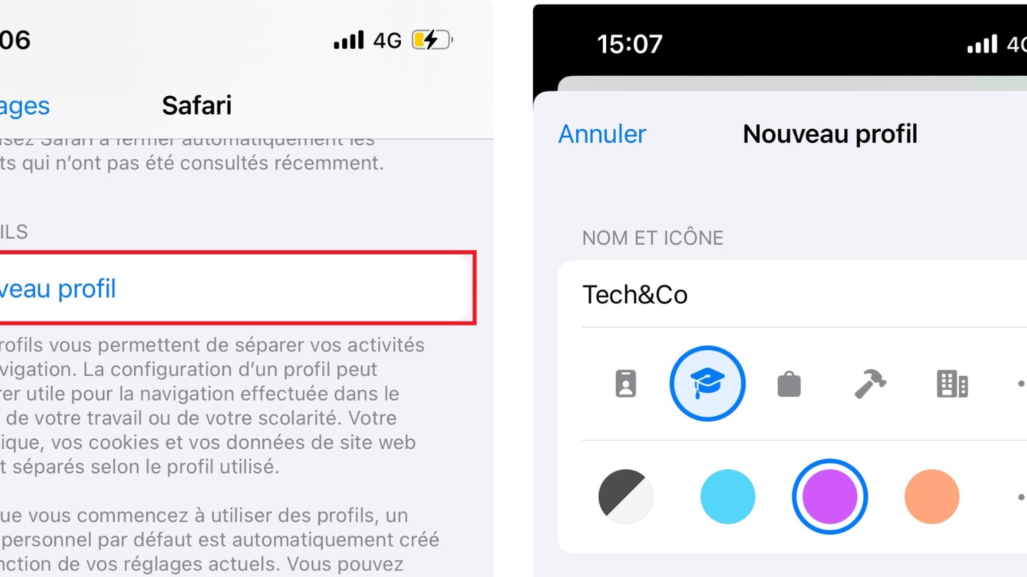 Vous pouvez éditer des profils dans le navigateur Internet Safari. Chacun d'entre eux dispose de son propre historique de navigation et de ses propres données des sites Internet visités. Cette fonctionnalité permet de séparer vos différents usages de Safari. Par exemple, si vous utilisez votre iPhone à la fois pour travailler et pour votre usage personnel.