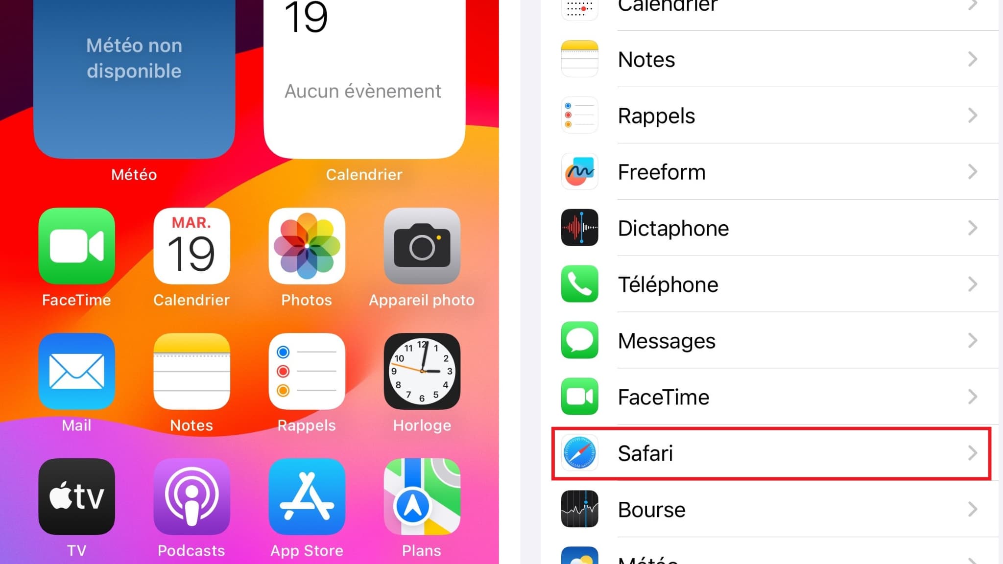 - Choisissez "Réglages" et cliquez sur "Safari"